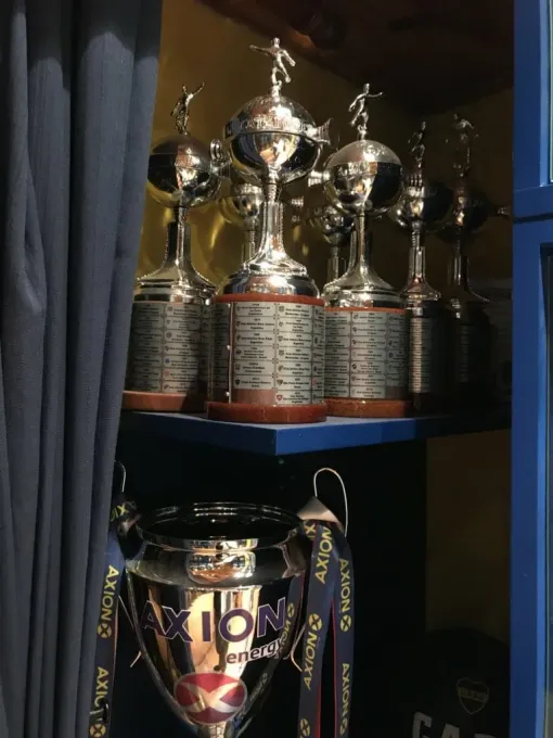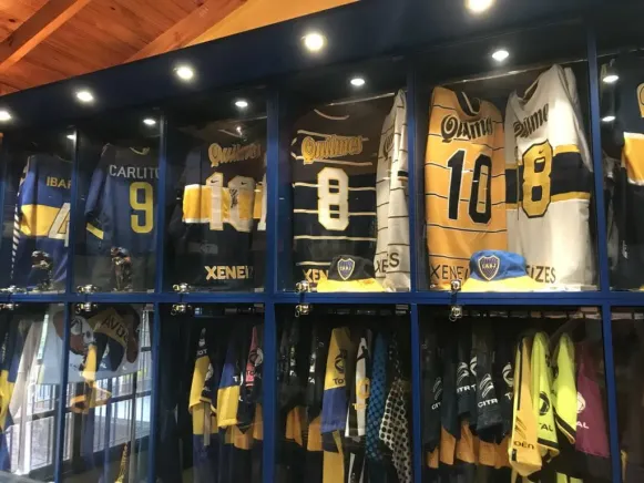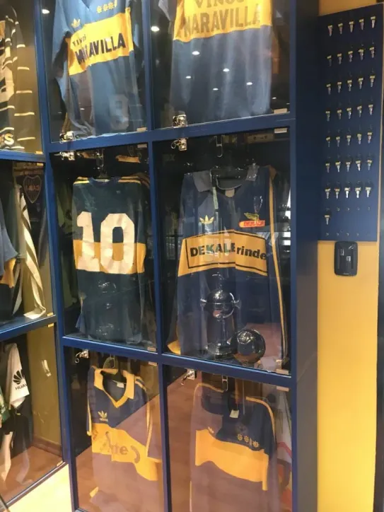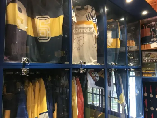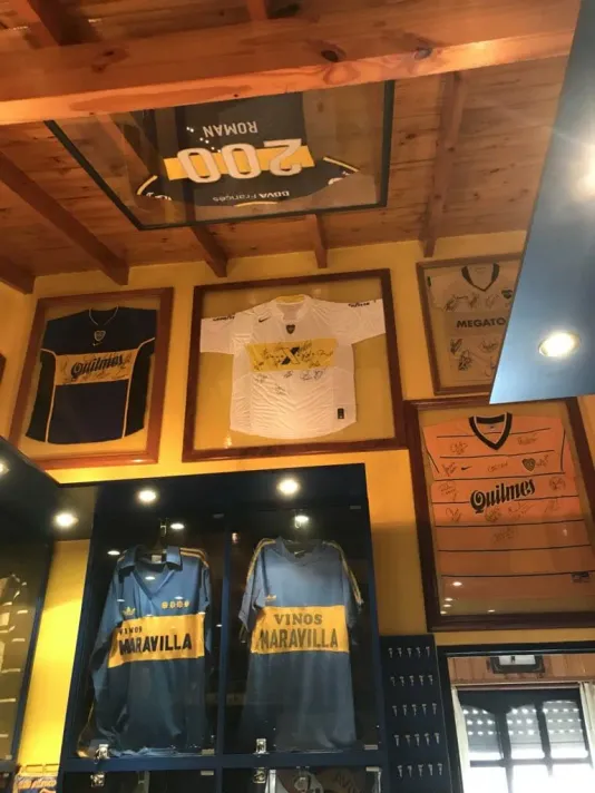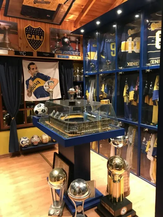 Réplicas de las Copas Libertadores, Intercontinental, Sudamericana, Recopa, miniaturas de esas copas, cuadros, medallas, pelotas y entradas viejas. Una mini Bombonera. Y muchas, muchísimas camisetas, de todas las épocas. Algunas firmadas por los jugadores. Esa habitación puede pasar tranquilamente como por un anexo de Brandsen 805.