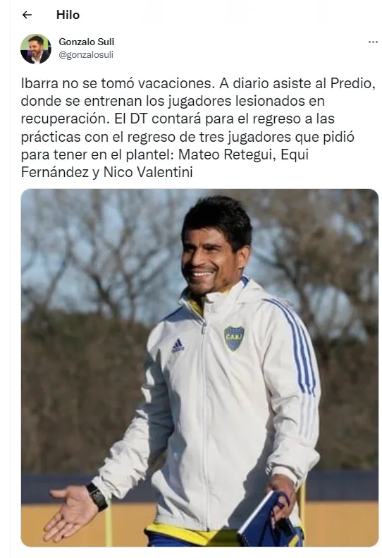Además, el cronista adelantó que al entrenador le cumplirían los sus tres primeros pedidos: la vuelta de Ezequiel Fernández, Mateo Retegui y Nicolás Valentini. “El DT contará para el regreso a las prácticas con el regreso de tres jugadores que pidió”, destacó.