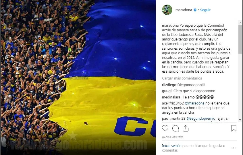 No podía faltar la opinión de Diego Armando Maradona respecto a los incidentes ocurridos el sábado en el Monumental. El actual DT de Dorados de México emitió un posteo en su cuenta de Instagram y elevó su pedido a Conmebol: quiere que le den los puntos y el título a Boca.