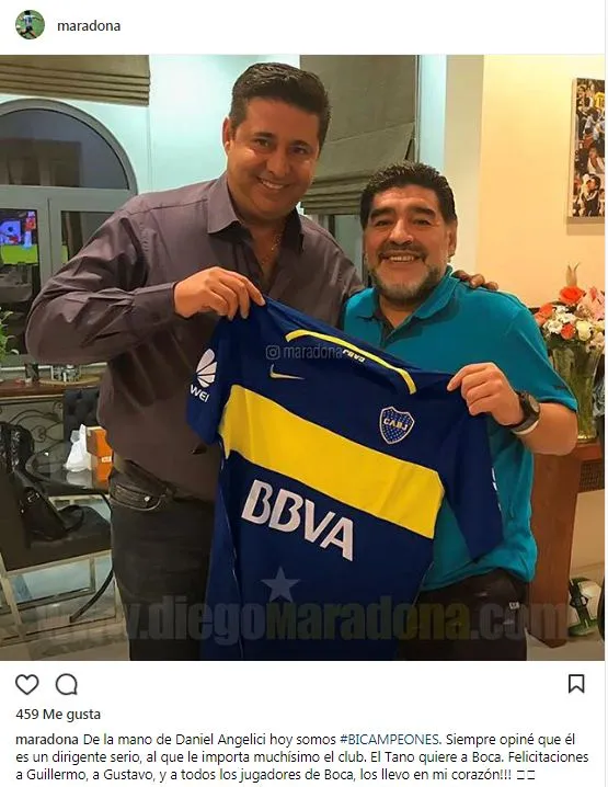Desde Dubai, Diego Armando Maradona manifestó su alegría por el campeonato de Boca, el club de sus amores. Lo hizo a través de su cuenta oficial de Instagram y con un posteo particular: una foto junto a Daniel Angelici, presidente de la institución.