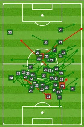 Ya con el colombiano afuera, el ex Lanús y Cruz Azul mostró muchísima efectividad y junto a Campuzano, se vio una mejor asociación. Según las estadísticas, dio 52 pases con un 92,3% de eficacia. De ellos, 23 pelotas fueron a campo rival con un 91,3% de acierto.