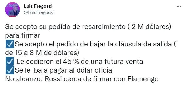 El primero de ellos era un resarcimiento por 2 millones de dólares que finalmente la comisión directiva cedió, además del 45% de una futura venta. También iba a abonarse su salario en dólar oficial, y se disminuía su cláusula de salida de 15 a 8 millones de dólares. Finalmente, todas estas opciones no sirvieron para Rossi que tendrá su segunda experiencia fuera del país.