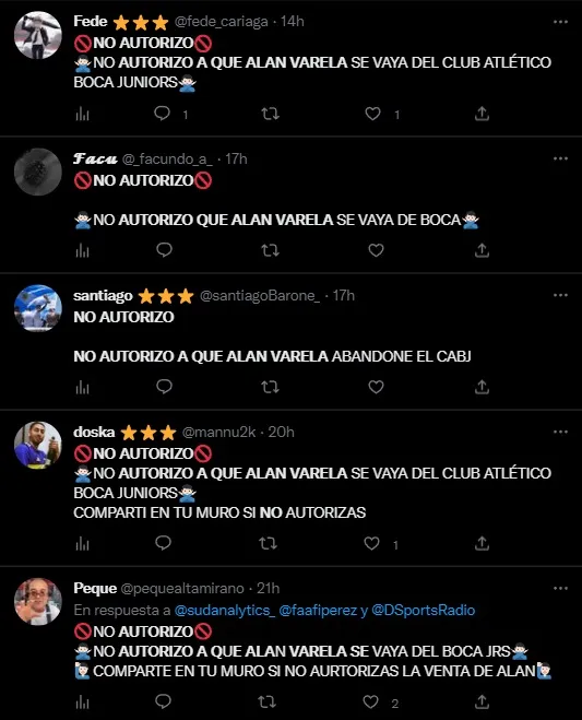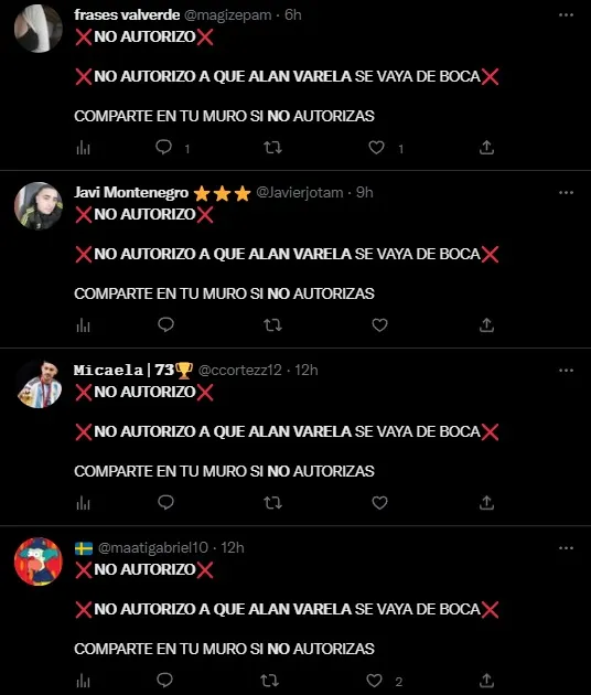 Ante la noticia, los hinchas dejaron en claro que no quieren que Alan se vaya eso derivó en una frase que se compartió en Twitter a modo de broma: “NO AUTORIZO A QUE ALAN VARELA SE VAYA DE BOCA. COMPARTE EN TU MURO SI NO AUTORIZAS”. Al estilo del viejo Facebook pero para expresar que el volante no puede irse del equipo en este momento.