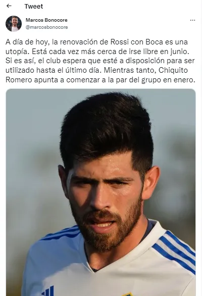 Así lo confirmó el periodista Marcos Bonocore. Quien en su cuenta de Twitter informó: “A día de hoy, la renovación de Rossi con Boca es una utopía. Está cada vez más cerca de irse libre en junio”.