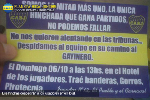 La gente de Boca está organizando una movida para acompañar a los jugadores en la previa del partido ante River. Comenzará el domingo, a las 13, en el Hotel Madero.