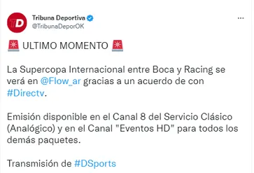 Pero en las últimas hora ese ítem cambió. La Supercopa Internacional también se podrá ver a través en Flow. La cadena llegó a un acuerdo en las últimas horas con Directv y compartirá las imágenes de la definición entre el Xeneize y la Academia.