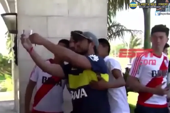 Un hombre con la camiseta azul y oro fue uno más del grupo que se fotografió con los futbolistas del Millonario. Les dejamos el video. ¿Qué opinan? ¿Es desacertado o colabora para desdramatizar el fútbol?