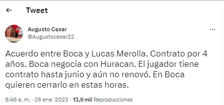 Según reveló el periodista Augusto César, ya hay acuerdo entre Boca y Lucas Merolla. “Contrato por 4 años. Boca negocia con Huracán. El jugador tiene contrato hasta junio y aún no renovó. En Boca quieren cerrarlo en estas horas”, destacó el cronista.