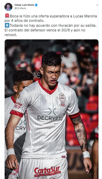 Además, César Luis Merlo, periodista especializado en mercado de pases, aseguró que “Boca le hizo una oferta superadora a Lucas Merolla por cuatro años de contrato. Todavía no hay acuerdo por Huracán por su salida”.
