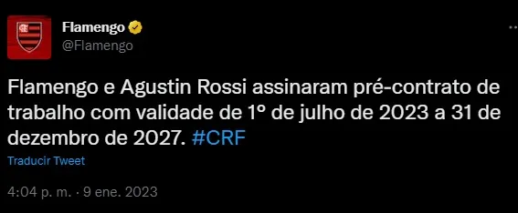 A partir del 1 de enero, el “Fla” y Rossi tenían la libertad legal de negociar y, al parecer, así fue. Este lunes 9 de enero, el club brasileño hizo el anuncio oficial de la firma de un precontrato con uno de los mejores arqueros de Sudamérica.