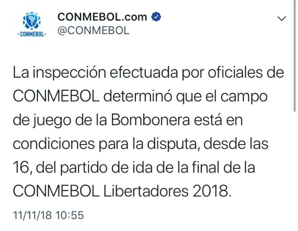 “Está muy bien la cancha”, dijo para los medios Roberto Tobar, el árbitro del partido. CONMEBOL ya lo hizo oficial. Habrá partido. Empieza la final. Y Boca va por la gloria.