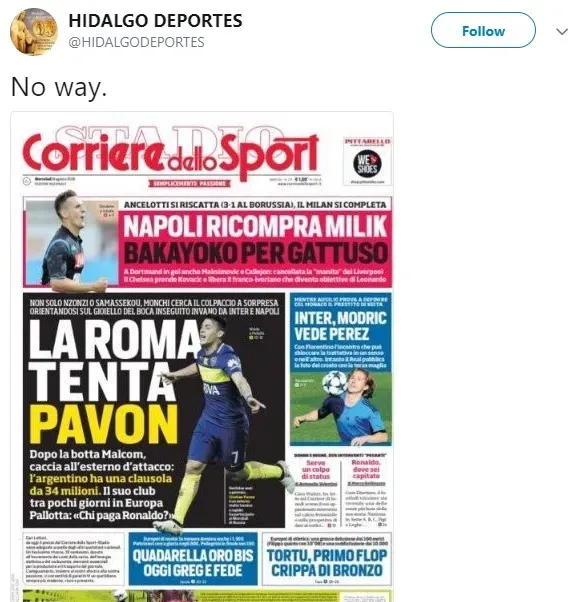 Para desactivar la alarma, Fernando Hidalgo, representante del delantero, se expresó vía redes sociales y en su cuenta de Twitter dejó un mensaje contundente: “No way”.