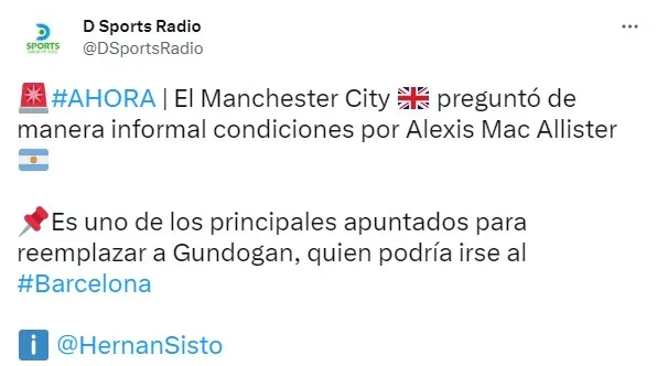 El periodista Hernán Sisto dio a conocer el jugador que interesa en los Citizens e informó: “El Manchester City preguntó de manera informal condiciones por Alexis Mac Allister Es uno de los principales apuntados para reemplazar a Gundogan, quien podría irse al Barcelona”.