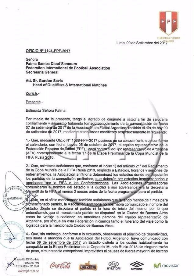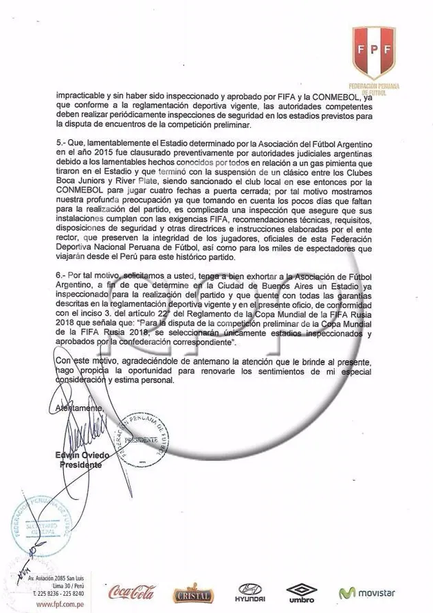 La Federación Peruana de Fútbol envió una carta a la FIFA pidiendo que el encuentro no se juegue en el estadio de Boca. ¿Los motivos? Los peruanos aseguran que el cambio de cancha se debe notificar con tres meses de anticipación y, a 30 días para el partido, aún no se sabe dónde será. Además, recurren al episodio del gas pimienta para afirmar que no es seguro jugar en La Bombonera.