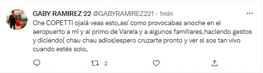 Luego, en una charla con el Diario Olé, Gabriel agregó: “Copetti no tiene códigos. Es muy de cobarde lo que hizo. Se metió con las familias. Se supone que es un profesional y un profesional tiene códigos. Dentro de los códigos en los jugadores está que la familia es sagrada. No se puede meter con eso”.