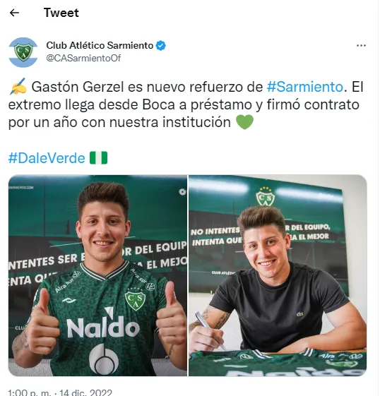Gerzel extendió su contrato con Boca hasta diciembre del 2025 y firmó en Junín hasta diciembre del 2023. “Gastón Gerzel es nuevo refuerzo de Sarmiento. El extremo llega desde Boca a préstamo y firmó contrato por un año con nuestra institución”, confirmó el club a través de sus redes sociales.