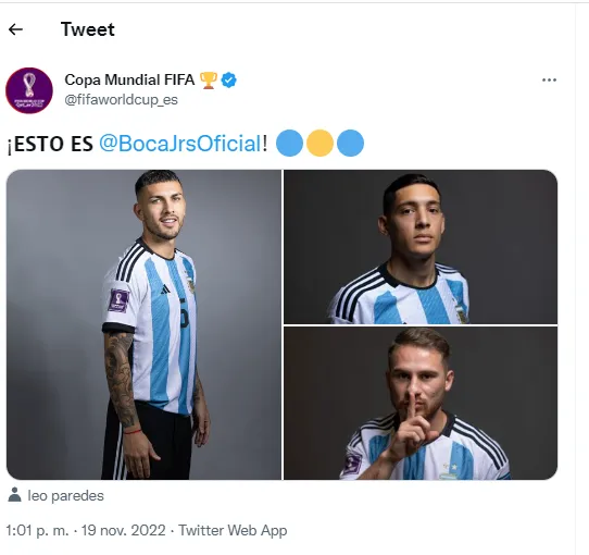 Los protagonistas del tuit son los tres jugadores de la Selección Argentina con pasado en el Xeneize: Leandro Paredes, Alexis Mac Allister y Nahuel Molina. “Esto es Boca”, escribió la cuenta oficial del Mundial. Y rápidamente se llenó de comentarios de los hinchas.