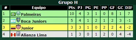 Actualmente, el conjunto brasileño suma 10 puntos y lidera el Grupo H. El Xeneize lo sigue con cinco y detrás vienen Junior con tres y Alianza Lima con uno.