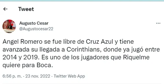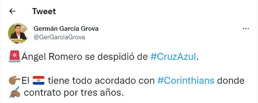 Sin embargo, su futuro parecería estar definido y no sería en Boca, sino en el Corinthians de Brasil. Así lo contó el periodista Augusto Cesar: “Ángel Romero se fue libre de Cruz Azul y tiene avanzada su llegada a Corinthians, donde ya jugó entre 2014 y 2019. Es uno de los jugadores que Riquelme quiere para Boca”.