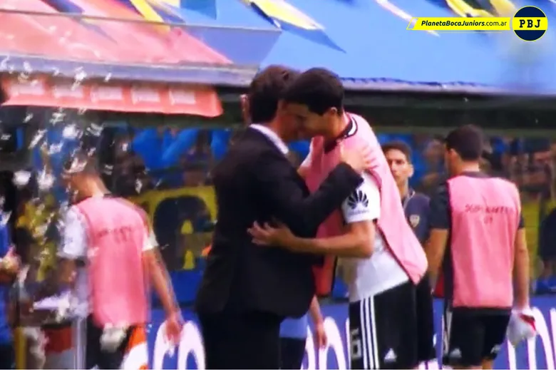 Un grupo de hinchas que se ubica en la platea preferencial aprovechó ese momento para llevar a cabo su gastada. Cuando los jugadores de River fueron a ubicarse al banco de suplentes, los recibieron con plumas.