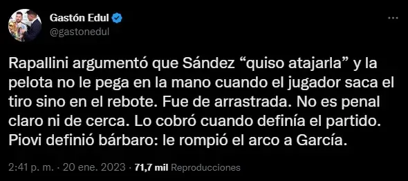 ¿Cuál fue la explicación de Rapallini? En su análisis de la polémica, el periodista Gastón Edul dio un detalle que pasó inadvertido: “Rapallini argumentó que Sández ‘quiso atajarla’ y la pelota no le pega en la mano cuando el jugador saca el tiro sino en el rebote. Fue de arrastrada. No es penal claro ni de cerca. Lo cobró cuando definía el partido. Piovi definió bárbaro: le rompió el arco a García”.
