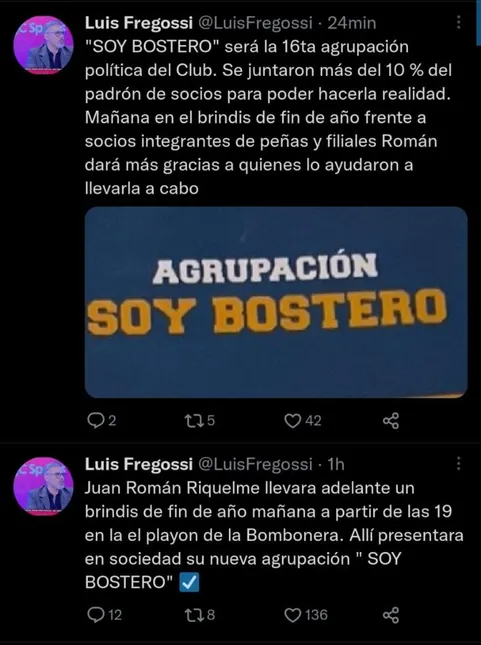 “Soy Bostero será la 16ta agrupación política del club. Se juntaron más del 10 % del padrón de socios para poder hacerla realidad. Este martes en el brindis de fin de año, frente a socios integrantes de peñas y filiales, Román dará las gracias a quienes lo ayudaron a llevarla a cabo“, agrego el cronista. De esta manera, ya se sabe que Riquelme tiene su propia agrupación y con mucha gente afiliada.