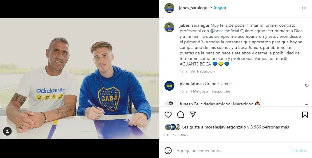 “Muy feliz de poder firmar mi primer contrato profesional con Boca”, escribió Jabes en su cuenta oficial. “Quiero agradecer primero a Dios y a mi familia que siempre me acompañaron y estuvieron desde el primer día, a todas la personas que aportaron para que hoy se cumpla uno de mis sueños y a Boca Juniors por abrirme las puertas de la pensión hace siete años y darme la posibilidad de formarme como persona y profesional. Vamos por más, ¡aguante Boca!”, agregó.