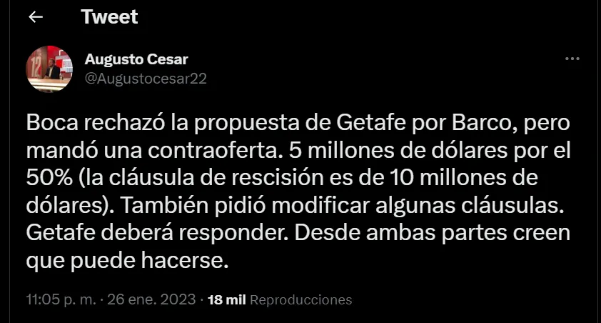 Según reveló el periodista Augusto César “Boca rechazó la propuesta de Getafe por Barco, pero mandó una contraoferta. 5 millones de dólares por el 50% (la cláusula de recisión es de 10 millones de dólares). También pidió modificar algunas cláusulas. Getafe deberá responder”.