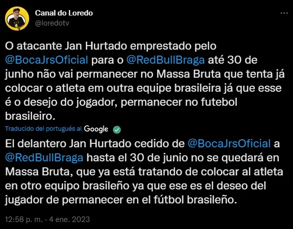 El periodista brasileño Loredo explicó: “El delantero Jan Hurtado, cedido de Boca a Bragantino hasta el 30 de junio, no se quedará en Massa Bruta, que ya está tratando de colocar al atleta en otro equipo brasileño, ya que ese es el deseo del jugador: permanecer en el fútbol brasileño”. ¿Logrará seguir en Brasil?