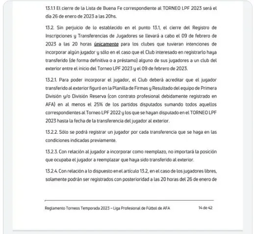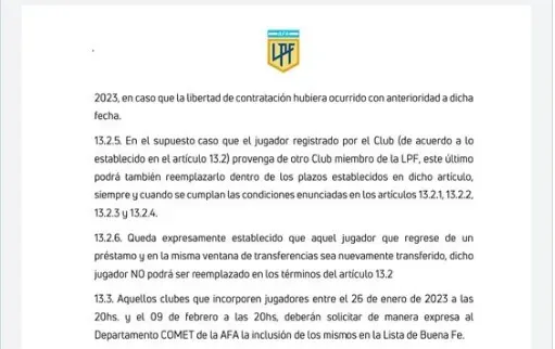 No es el único dato ya que hay algunas excepciones. Por ejemplo, toda institución que venda o preste un futbolista al exterior, tendrá tiempo para incorporar hasta el 9 de febrero. Mientras que puntualizando en los jugadores que se encuentran en condición de libres, podrán ser contratados luego del 26 de enero.
