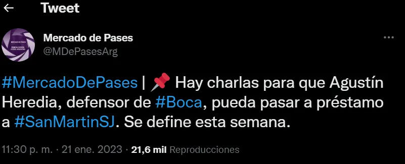 Según informó la cuenta Mercado de Pases Argentina, el futuro del defensor de 25 podría estar en San Martín de San Juan. “Hay charlas para que Agustín Heredia, defensor de Boca, pueda pasar a préstamo a San Martin de San Juan. Se define esta semana”.