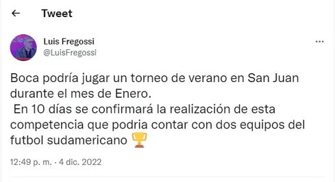 En un semestre que estará cargado de compromisos, el mismo iniciaría con un Torneo de Verano. Así lo informó el periodista Luis Fregossi en su cuenta de Twitter: “Boca podría jugar un torneo de verano en San Juan durante el mes de enero. En 10 días se confirmará la realización de esta competencia que podría contar con dos equipos del futbol sudamericano”.