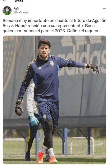 Según reveló el periodista Facundo Pérez, la que sigue será una “semana muy importante en cuando el futuro de Agustín Rossi, habrá una reunión con el representante”. Además, el cronista destacó: “Boca quiere contar con él para el 2023. Define el arquero”.