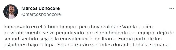 “Impensado en el último tiempo, pero hoy realidad: Varela, quién inevitablemente se ve perjudicado por el rendimiento del equipo, dejó de ser indiscutido según la consideración de Ibarra. Forma parte de los jugadores bajo la lupa. Se analizarán variantes durante toda la semana”, indicó el periodista Marcos Bonocore.