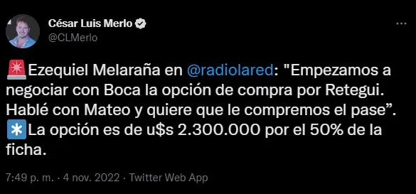 Ahora, además, Ezequiel Melaraña, presidente de Tigre, manifestó en Radio La Red cuál es la intención del jugador: “Empezamos a negociar con Boca la opción de compra por Retegui. Hablé con Mateo y quiere que le compremos el pase”. El periodista César Merlo agregó un detalle: “La opción es de u$s 2.300.000 por el 50% de la ficha”. ¿Fin de la novela?