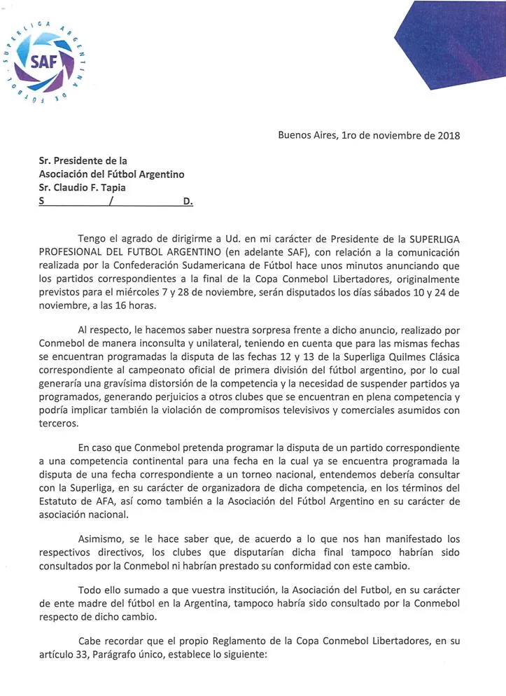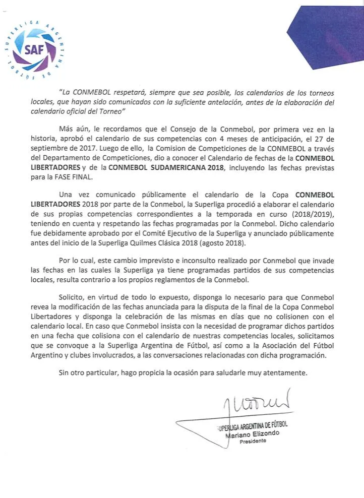 Por esa razón, enviaron una carta a la Asociación del Fútbol Argentino (AFA) solicitándole a la Confederación Sudamericana de Fútbol que revea la decisión. Además expresaron que, si persiste esta idea, se convoque a la Superliga, a la Asociación y a ambos clubes para tomar una determinación en forma consensuada que no afecte al torneo local.