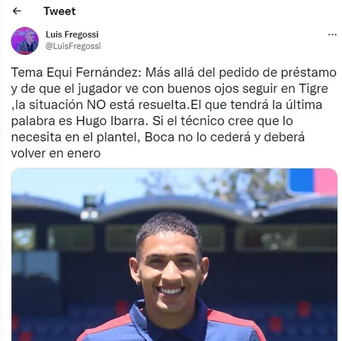 Anteriormente, se mencionó en reiteradas ocasiones la chance de que el mediocampista siga en Tigre un año más. Incluso su presidente Ezequiel Melaraña manifestó su deseo de tenerlo para el 2023 donde disputará Copa Sudamericana. Mientras tanto, el futbolista entrena en Mapuche. ¿Dónde jugará el próximo año?¿Boca o Tigre?