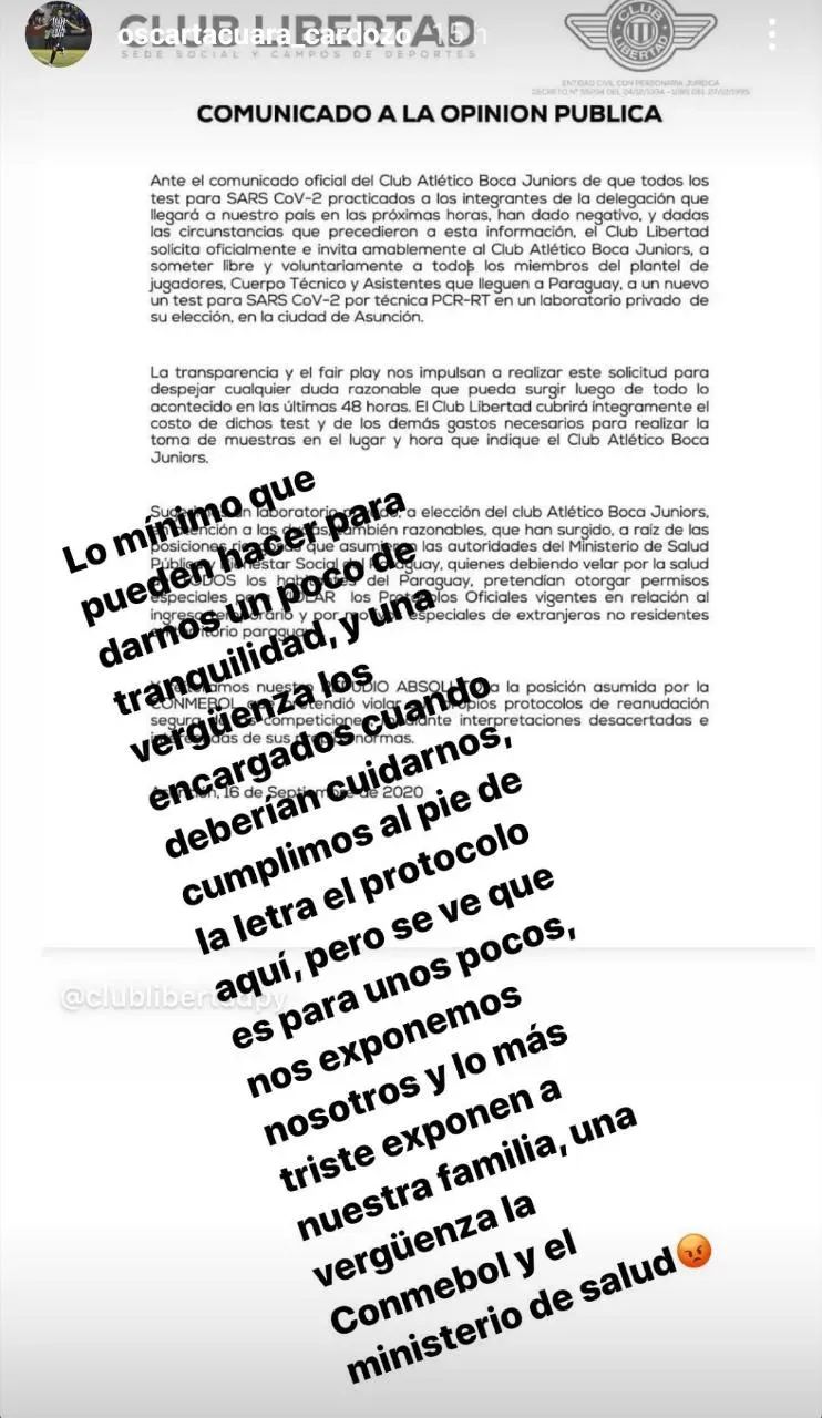 De la empatía y solidaridad de hace unos días a la desconfianza total. Así se movió Libertad de Paraguay en la antesala del choque frente al último campeón argentino, que no se realizará más exámenes ya que presentó todo en tiempo y forma ante las autoridades.