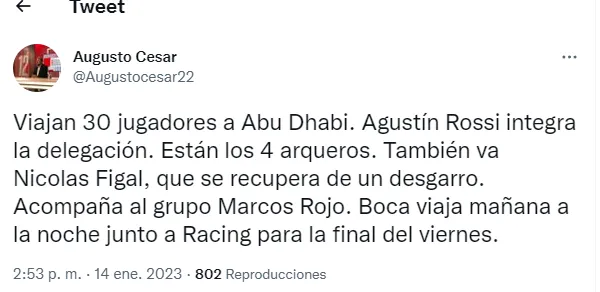 Que sí, que no, que depende. Finalmente Agustín Rossi formará parte de la delegación que viajará a Abu Dhabi para la Supercopa Internacional contra Racing. Serán 30 los futbolistas que estarán en la primera definición del año. Incluido Marcos Rojo, quien acompañará al plantel.