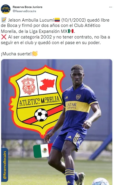 Es el caso de Jeison Ambuila Lucumi. Según contó la cuenta “Reserva Boca Juniors” el defensor colombiano categoría 2022 quedó libre de Boca y firmó por dos años con el Club Atlético Morelia, de la Liga Expansión MX.