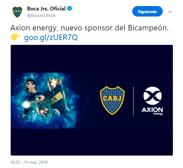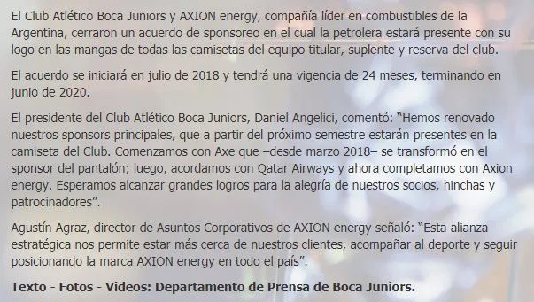 ¿Cuál es la empresa? Se trata de Axion Energy, que ya tiene contacto con el mundo deportivo. El vínculo será hasta junio de 2020 y el logo de la marca se ubicará en las mangas de la camiseta.