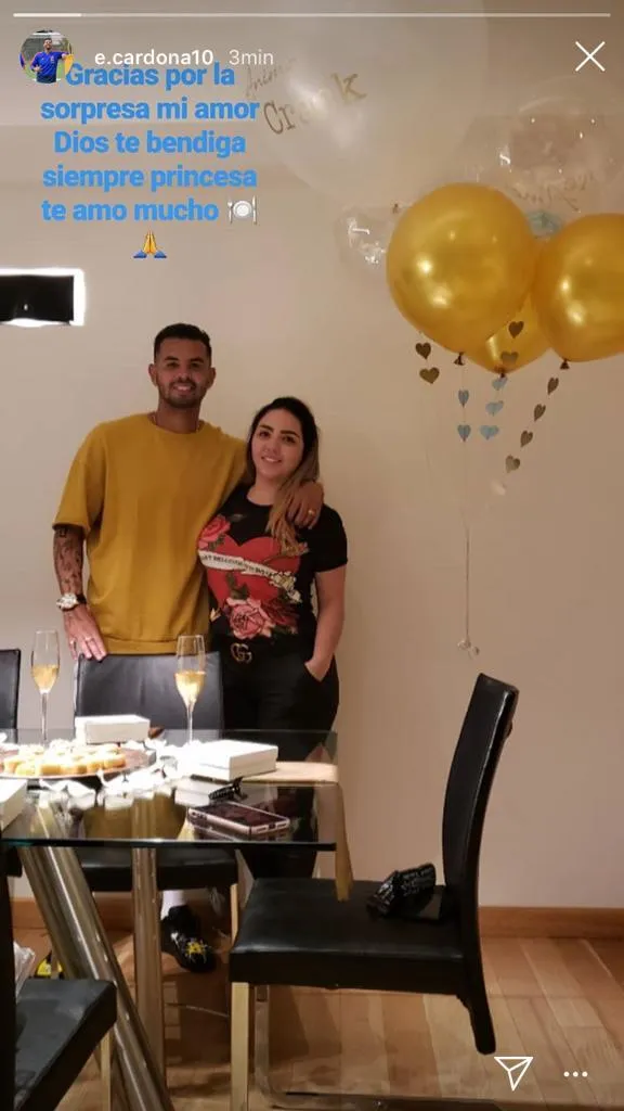 La novia del volante lo recibió con una cena y globos con el mensaje “Ánimo, crack”. Él le agradeció a través de Instagram: “Gracias por la sorpresa mi amor, Dios te bendiga siempre, princesa. Te amo mucho”.