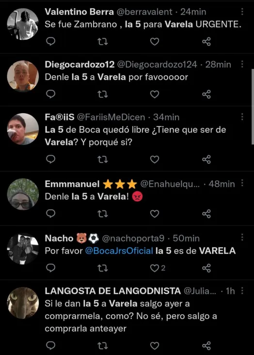 Con la dirigencia trabajando en la búsqueda de otro defensor, en Twitter se realizó una campaña para que Alan Varela sea el encargado de vestir la dorsal n°5, que vistió el “Kaiser” en sus casi tres años en el club de la Ribera.