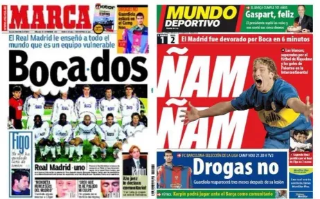 Somos la humildad de Román que nunca había estado en un piso 37, como en el hotel de Tokio, que todavía no puede creer que nos llevaría a la cima Mundial. Se preocupa por pedirle la camiseta de Figo para su papá, mientras nosotros no sabemos qué hacer ni cómo festejar. Palermo tampoco que llora con la camiseta de Morientes; Barijho menos, porque se ríe sin caer todavía con el buzo del arquero de ellos. Es la mirada incrédula de Figo y el reto de Hierro, porque le demuestran al mundo que sí les importa esta Copa. Es la seguridad en la boca de Maradona, de que esto les duele a los de blanco. Y es La Boca que está de punta en blanco para festejar como Diego, que en el balcón de su casa está desaforado. Tiene la camiseta con el 2 en la espalda, la del penal vs Palmeiras para ganar el pasaje a esta final. El mejor de la historia festeja que se hace historia y se ríe de las gashinas que no trajeron la copa, es el regalo de papá anticipado. Es una locura total.