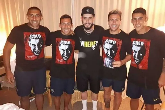 Mientras se prepara para enfrentar a River, el plantel de Boca tuvo una visita en la pretemporada. Tevez, Wanchope, Pavón y Buffarini recibieron a uno de los artistas del momento.