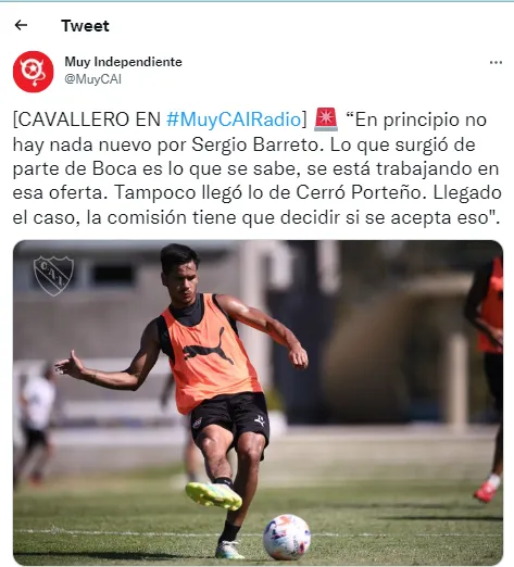 Pablo Cavallero, manager del club de Avellaneda, habló con “Muy Independiente” y admitió todos los detalles trascendidos sobre la negociación. “En principio no hay nada nuevo por Sergio Barreto. Lo que surgió de parte de Boca es lo que ya se sabe, se está trabajando en esa oferta”, destacó.