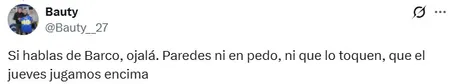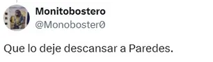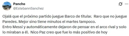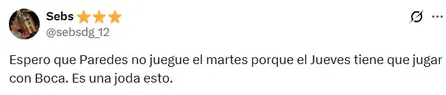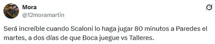 El encuentro está programado para el martes por la noche. Y a dos días del duelo clave contra Talleres en Córdoba, los simpatizantes del Único Grande no quieren que arriesgue al mediocampista. Así como algunos expresaron su enojo porque el exPSG no jugó, otros ya piensan en el Torneo Apertura. “Espero que Paredes no juegue el martes”, “Paredes ni en pedo, que ni lo toquen” o “Que lo deje descansar” fueron algunos de los comentarios.